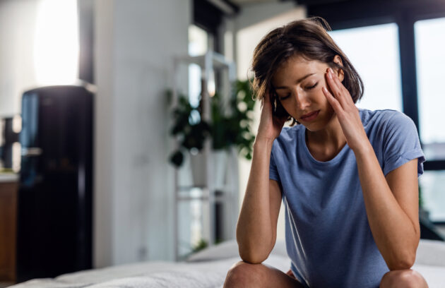 Sad woman suffering from headache and sitting on the bed with eyes closed while holding her head in pain. Conviver…